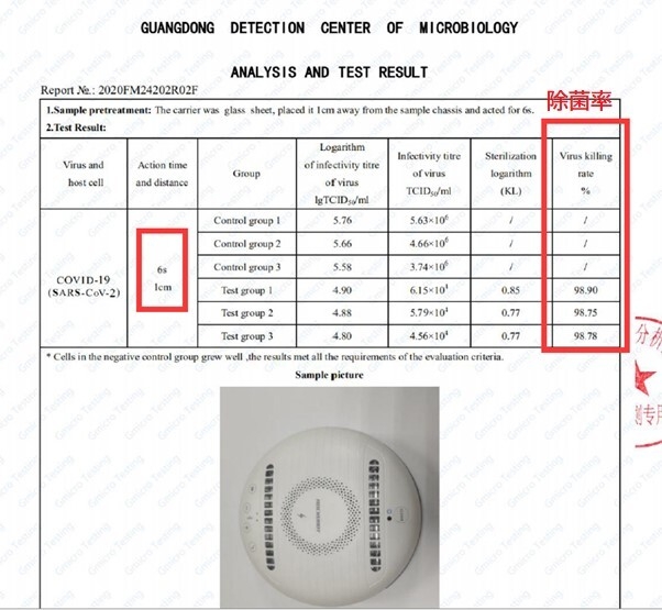 また、【除菌ロボットROCKUBOT】は世界トップレベルの第三者検査機関Guangdong Detection Center of Microbiologyによる新型コロナウイルスの不活化試験において、わずか6秒で98.75%以上のウイルスを不活化できることが正式に検査結果として立証されました。